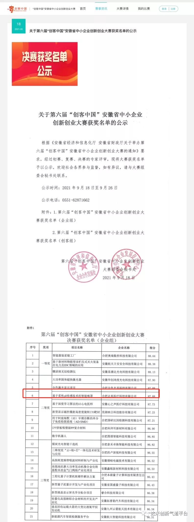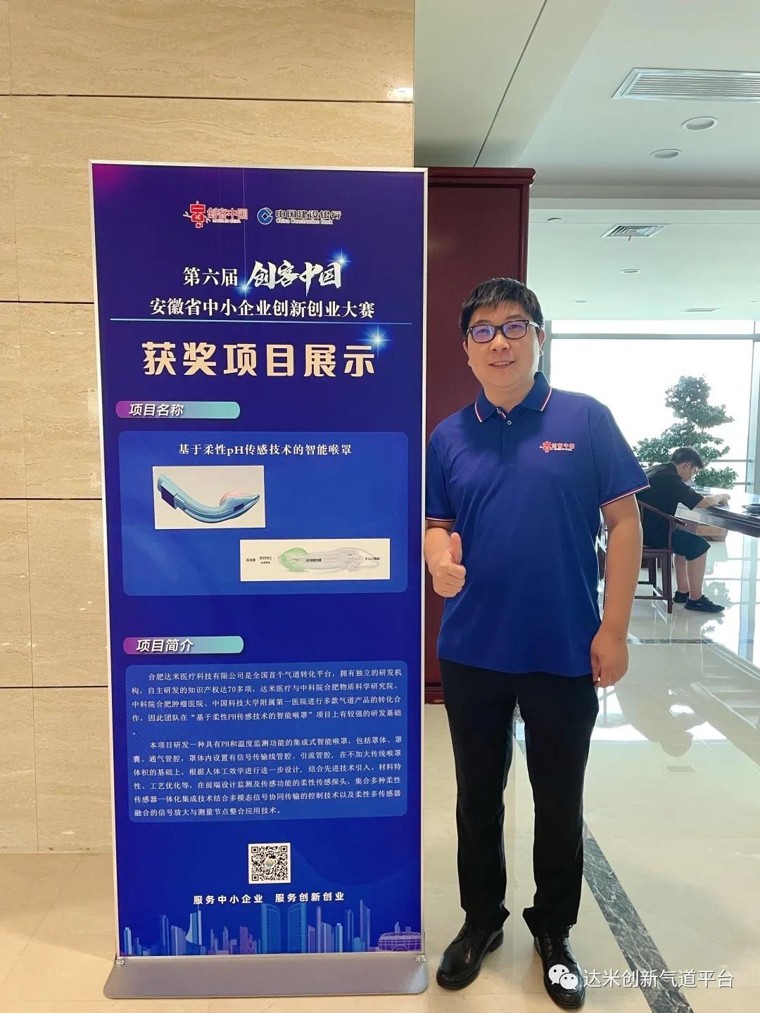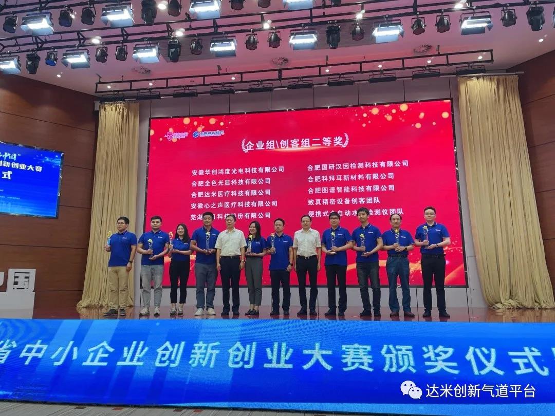 合肥達米醫(yī)療科技有限公司榮獲由安徽省經(jīng)濟和信息化廳、安徽省財政廳主辦的第六屆“創(chuàng)客中國”安徽省中小企業(yè)創(chuàng)新創(chuàng)業(yè)大賽企業(yè)組二等獎